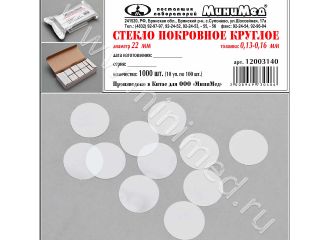 Стекло покровное круглое диам.22 мм,толщ.0,13-0,16 мм, уп.1000 шт./ кор. 50 000 шт.