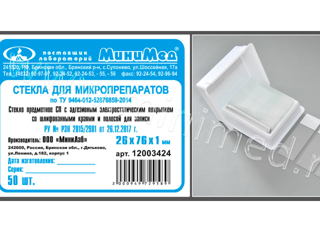 Стекло для микропрепаратов по ТУ 9464-012-52876859-2014, предметное, СП c адгезивным электростатическим покрытием, SuperFrostPlus, со шлиф.краями и полосой д/записи, 26*76 мм, толщ. 1,0 мм, уп.50 шт/2500 шт
