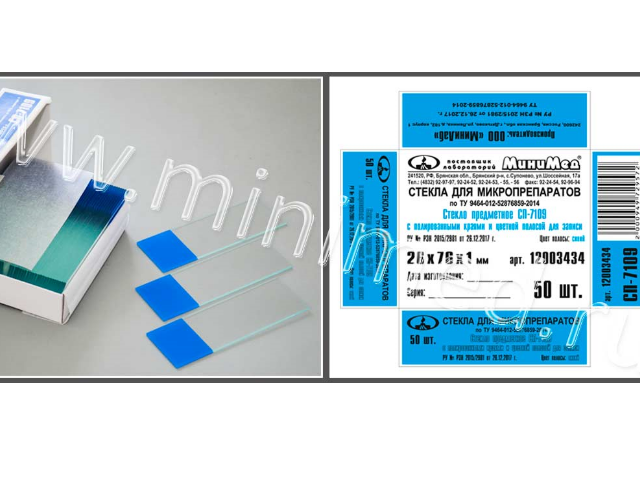 Стекло предметное со шлифованными краями и полосой для записи. Полоса выполнена методом шелкографиии, это позволило получить поверхность удобную для записи. Изготовлено из прозрачного бесцветного силикатного стекла.
