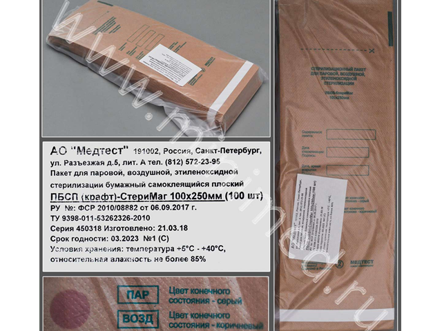 Пакет для паровой, воздушной, этиленоксидной стерилизации бумажный (крафт) самоклеящийся плоский ПБСП-СтериМаг 100*250, уп.100шт