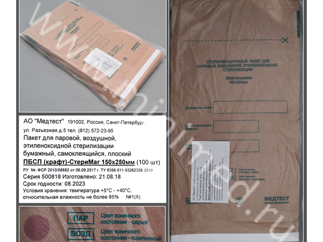 Пакет для паровой, воздушной, этиленоксидной стерилизации бумажный (крафт) самоклеящийся плоский ПБСП-СтериМаг 150*250, уп.100шт
