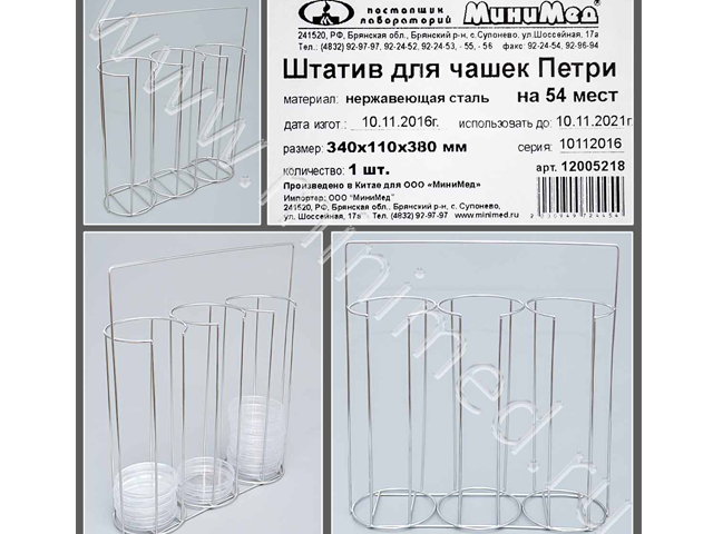 Предназначен для транспортировки чашек Петри диаметром до 100 мм. В каждом из 3 отделений штатива помещается 18 чашек. Изготовлен из нержавеющей стали.