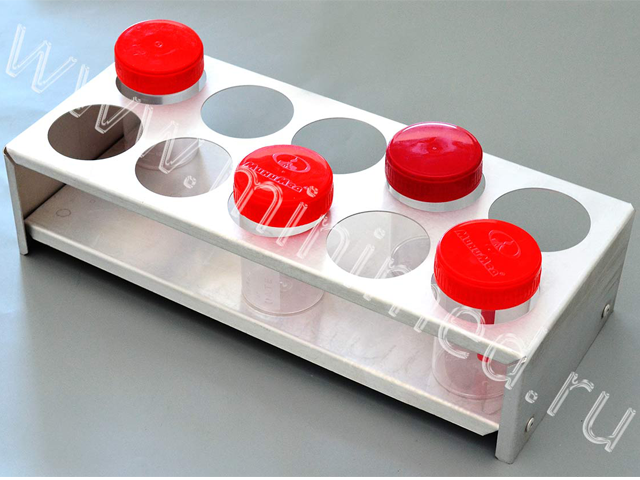 Штатив изготовлен из алюминия, что позволяет стерилизовать их при любом температурном режиме; данный материал обеспечивает легкость и долговечность. Может использоваться в водяных банях. Штатив имеет индивидуальную упаковку. Предназначен для хранения контейнеров объемом до 60 мл.