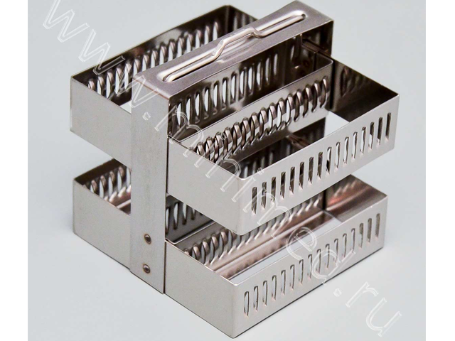 Штатив - рамка предназначена для размещения  предметных стекол 76x26x1 мм, максимальное количество —30 шт. Вертикальная загрузка стекол. Изготовлена из нержавеющей стали.