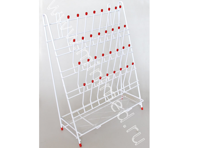 Представляет собой металлическую конструкцию, состоящую из стойки для сушки лабораторной посуды и пластикового поддона для воды. Имеет четыре ряда металлических штырьков с пластиковыми колпачками для лабораторной посуды любого вида (пробирки, колбы, стаканы и пр.). Возможна установка сушилки на мойке на ножках. Имеет крепления для подвеса сушилки на стену.