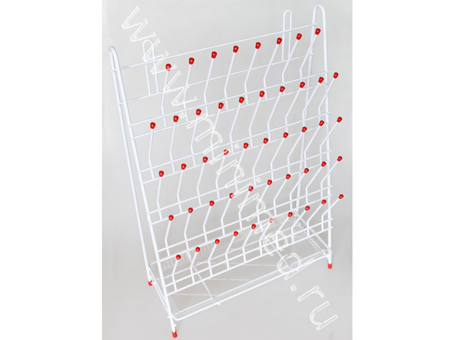 Представляет собой металлическую конструкцию, состоящую из стойки для сушки лабораторной посуды и пластикового поддона для воды. Имеет четыре ряда металлических штырьков с пластиковыми колпачками для лабораторной посуды любого вида (пробирки, колбы, стаканы и пр.). Возможна установка сушилки на мойке на ножках. Имеет крепления для подвеса сушилки на стену.