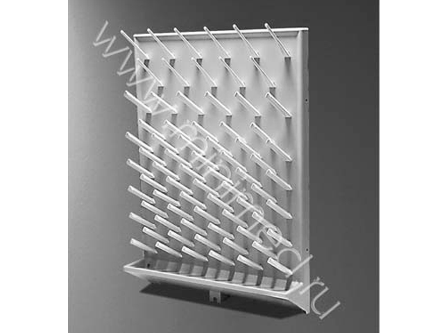 Представляет собой цельную панель из ударопрочного полистирола толщиной 4 мм. На поверхности панели имеются специальные отверстия для штырьков. Данная сушилка используется для работы со всеми типами лабораторной посуды.