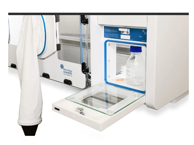 Воздушный шлюз объемом 17,5 л обеспечивает эффективную передачу до 10 бутылок Duran по 500 мл на рабочую станцию и обратно всего за 2 минуты. Запатентованные овальные порты для перчаток обеспечивают максимальный комфорт при длительном использовании.