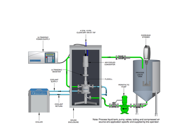 Для непрерывной обработки материала предлагается модель Q2000FCE. Комплект включает проточную ячейку (Кат. № 4678), защитный кожух (Кат. № 4475), чиллер (Кат. № 4906).