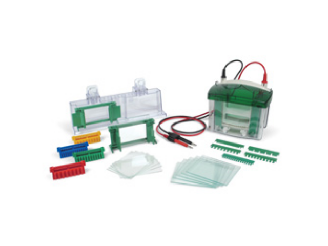 Вертикальная система электрофореза с 4 гелями, толщина геля 1,0 мм, включает литейную стойку, 2 литейные рамки, 10-луночные гребни, 5 коротких планшетов и 5 дистанционных планшетов.