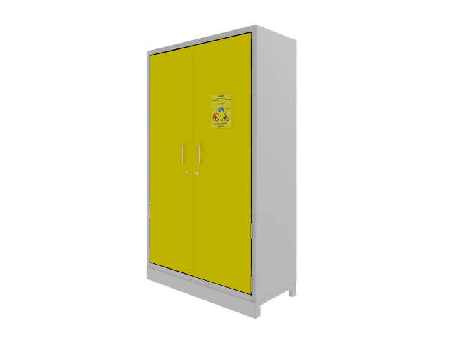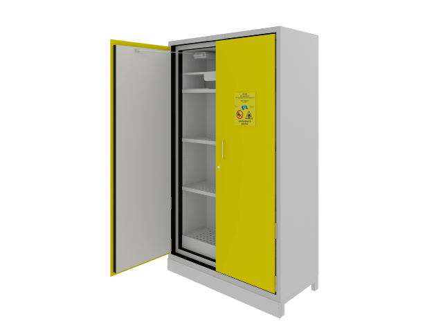 Шкаф оснащен механизмом принудительного закрывания дверей на случай возникновения возгорания в помещении. Он срабатывает в автоматическом режиме и удерживает дверь в закрытом положении. Сама дверь крепится к каркасу с помощью огнеустойчивых петель, которые располагаются по всей длинной стороне. Шкаф запирается с помощью цилиндрового замка ключом. Опора конструкции предусматривает регулируемые ножки, которые позволяют изменять высоту изделия.