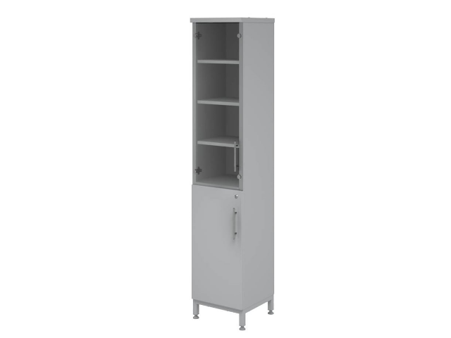 Для производства верхней двери шкафа для хранения посуды в лабораторию задействовано стекло с толщиной в 0,5 см. Нижняя дверь – глухая, дополняется замком, реализована в замкнутом формате, изготовлена из двойной листовой стадии с толщиной в 0,1 см.