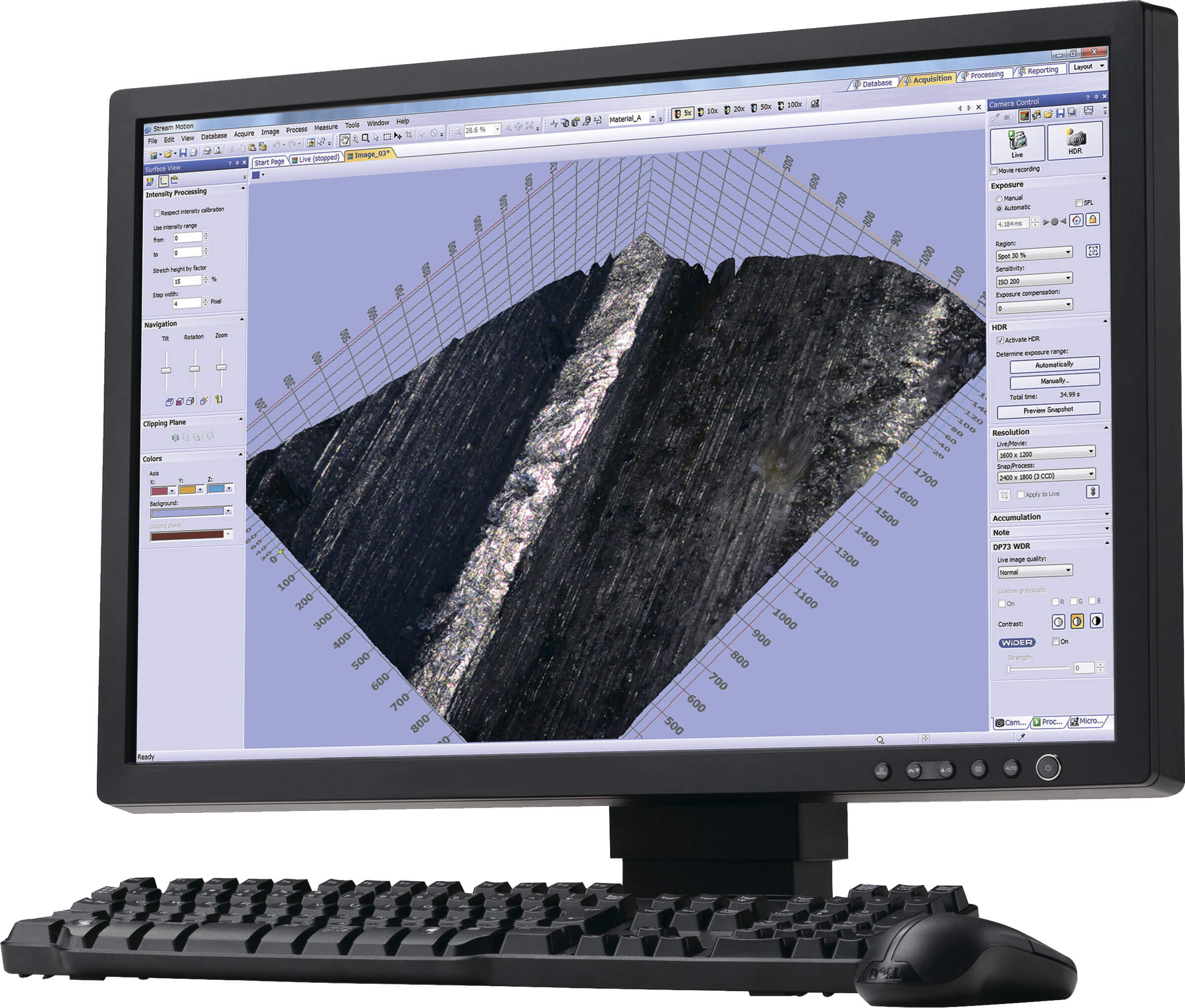 Система анализа изображений OLYMPUS Stream позволяет получать изображения, в том числе с помощью функций: расширенный фокус, 3D реконструкция, сшивка и т.д.; обрабатывать полученные изображения при помощи функций: баланс белого, теневая коррекция, RGB-фильтры, контроль экспозиции и т.д.; проводить различные измерения: расстояние между точками, между центрами окружностей, измерение радиусов и диаметров по 3 точкам, углы, площади и периметры и т.д.