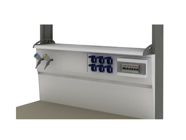 Стойки изготовлены из высококачественного алюминиевого сплава. Под нижней полкой расположена сегментная сервисная панель. Каждый сегмент представляет быстросъемную панель. Панели закрывают доступ к коммуникациям и предназначены для размещения на них различного инженерного оборудования. На одной панели в штатной комплектации стеллажа расположены три пыле- влагозащищенные розетки на 220 вольт, закрывающиеся крышками. На другой панели установлен автомат аварийного отключения питания 16А. лабораторной посуды.