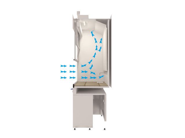 Каждый вытяжной химический шкаф, изготовленный из металла, состоит из двух главных элементов: нижней тумбы, выступающей в качестве подставки, и верхнего рабочего блока. Последний представляет собой закрытую камеру, оборудованную особой рабочей поверхностью, здесь располагается защитный экран, который при необходимости можно опустить.